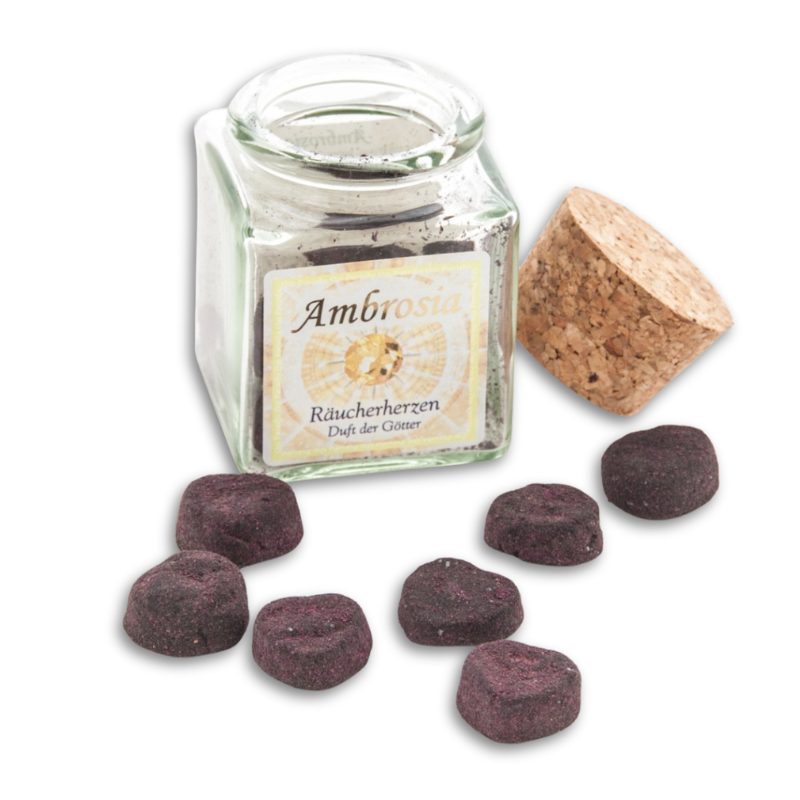 Seit Jahren gehören die Ambrosia Räucherstäbchen zu den beliebtesten in unserem Sortiment. Für alle Liebhaber des Duftes bieten wir auch Ambrosiaherzen pur zum Räuchern auf Kohle oder Sieb an. Die gleichen wundervollen Ingredienzien in geballter Form sorgen für ein unvergessliches Erlebnis. Ein göttlicher Duft, den man sich selbst gönnen sollte, jedoch auch von Herz zu Herz als liebevolles Geschenk weiterreichen kann.