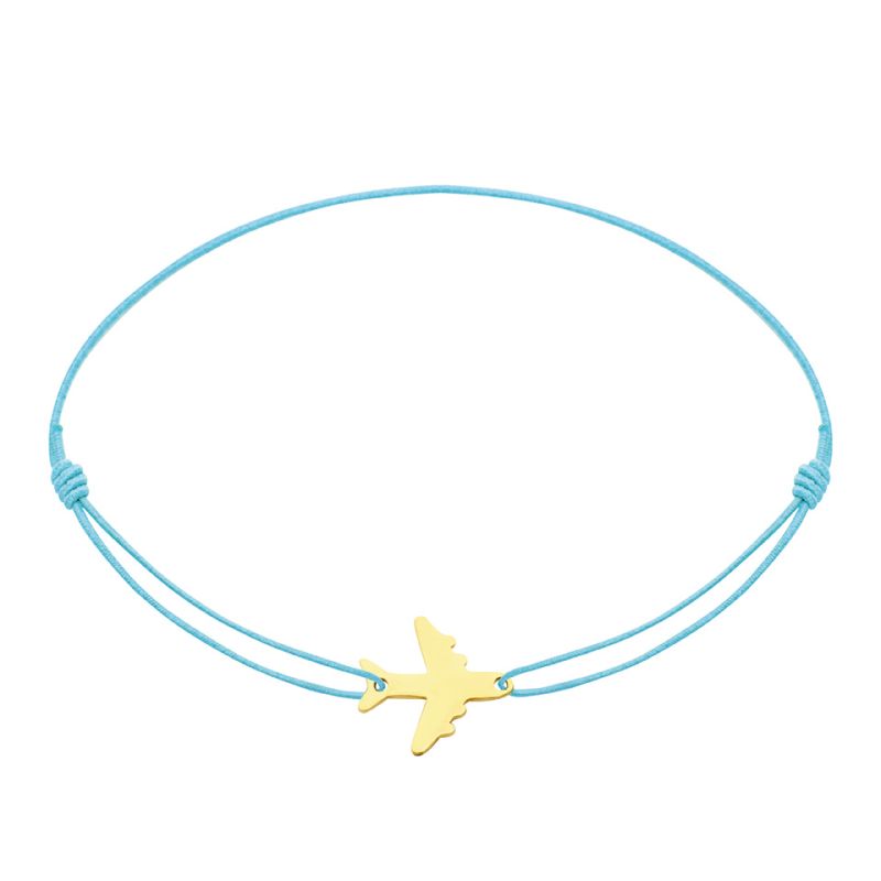 Zartes Armband mit vergoldetem Flugzeug-Symbol. Durch das elastische Band und die verstellbaren Knoten ist das Armband flexibel in der Länge verstellbar.