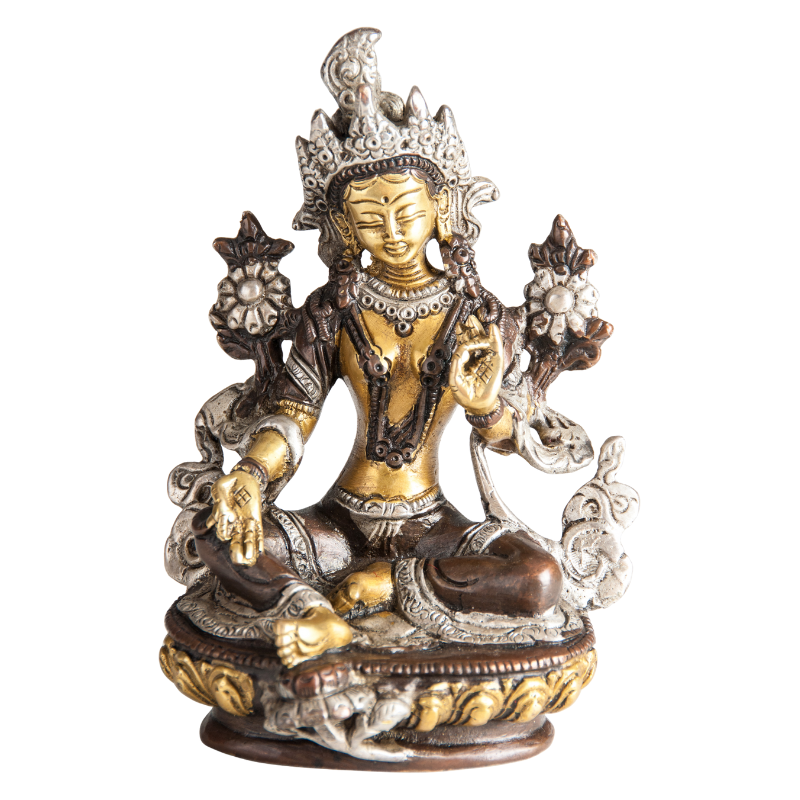 Tara verkörpert die weibliche Gottheit an sich. Ihr Name bedeutet sowohl „Stern“ als auch “Retterin“. In Tibet heißt sie „Dölma“, was einfach Mutter bedeutet. Sie wird dort als Mutter aller Buddhas verehrt. Ihre rechte Hand ist in der Geste der Wunschgewährung nach unten gerichtet, die linke Hand zeigt die Geste der Schutzgewährung.