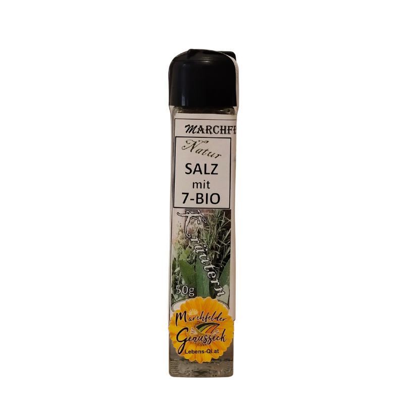 Kräutersalz 7-Bio Kräuter mit einer Kräutermischung aus Marchfelder Bio Kräuter – perfekt für die Österreichische Küche, im praktischen, hochwertigen Streuer aus Glas