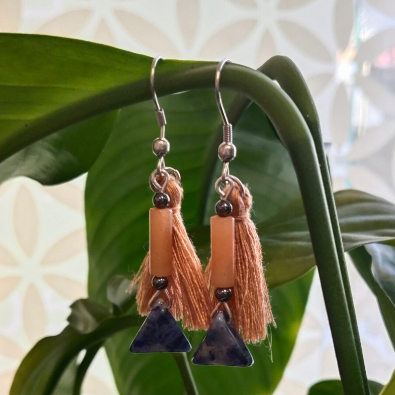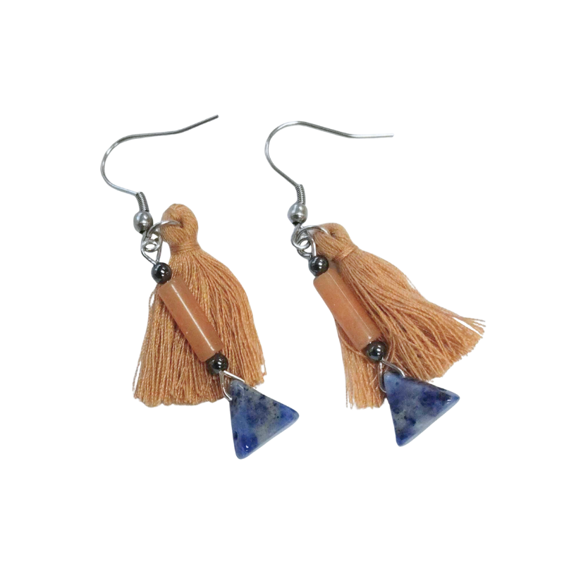 Extravagante Ohrringe aus Stäbchen (ca. 14×4 mm), Dreiecken (ca. 11×13 mm) und Kugeln (ca. 3 mm) & Textil-Tassle