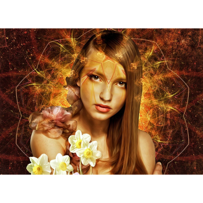 Eine Frau mit Narzissen und mandalaartigem Hintergrund