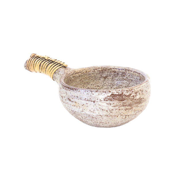 Räucherschale aus Ton, mit beige-weißer Glasur und mit Rattan umwickelten Griff.