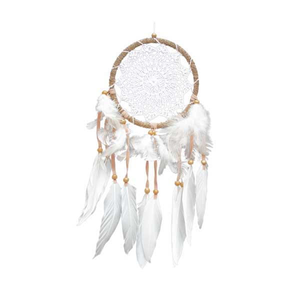 Dekoriert mit weißen Federn und Holzperlen. Das Netz ist gehäkelt.