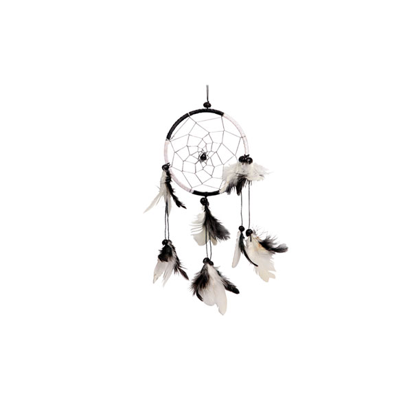 Dekoriert mit schwarzen und weißen Federn und schwarzen Holzperlen