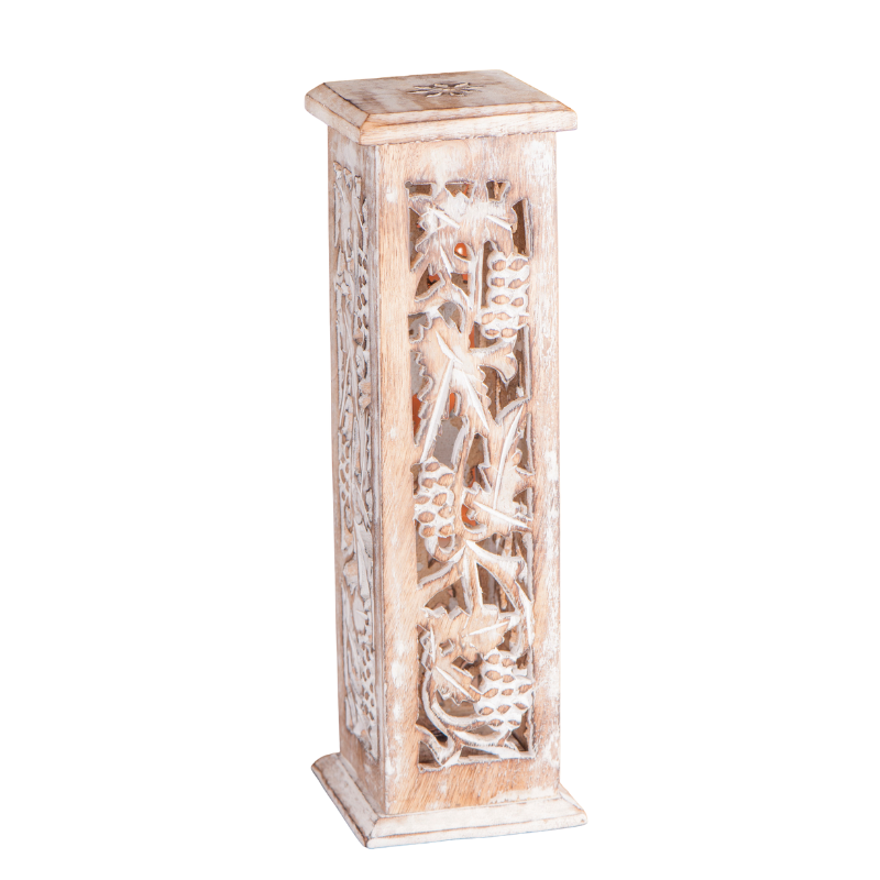 Weinranke – Räucherturm aus weiß gewachstem Mangoholz mit ausgefeiltem Weintraubenmuster