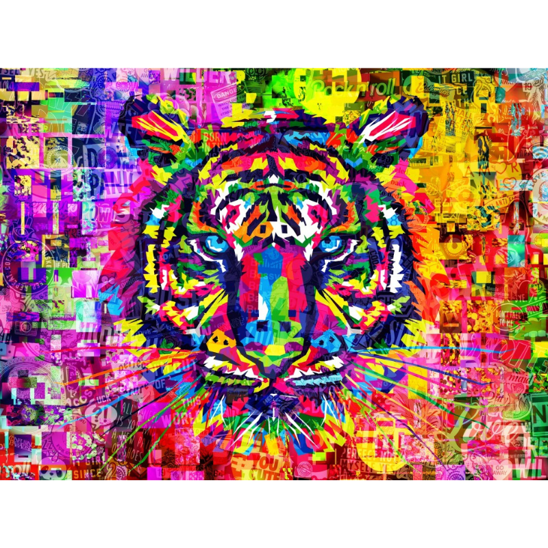 Ein spektakuläres Puzzle mit einem farbenfrohen Tiger-Porträt im Pop-Art-Stil
